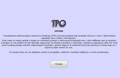 TPO Foundation is conducting a baseline study as part of Women, Peace-building and Reconciliation in BiH Project. The purpose of the study is to detect women peace-builders and find out the attitudes of citizens in BiH on peace and peace-building activities, with particular emphasis on the role of women. The citizen survey has been completed and results are being analyzed. We plan to conduct a survey among NGO activists using a web-based questionnaire that is available on TPO Foundation's website, but you can also access it via: http:/ /anketa.tpo.ba/