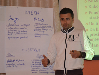 In front of the Student Union in Tuzla, Adnan Sunj and Ena Alibegovic presented voluntary action organized by their own initiative in the areas affected by floods and landslides in the period between 10-17 of May, 2014 in the area of Orasje, Maglaj, Zavidovici and Zepa. They presented the process of organizing the collection of technical and financial support, and basic needs related to food, medicines and disinfectants. Attendees had the opportunity to exchange their experiences in volunteer activities, obstacles, problems and methods of crisis management in this action. Dr. Delic then presented a SWOT analysis as a tool for strategic planning. This analysis identified external and internal factors that favor or impede achieving